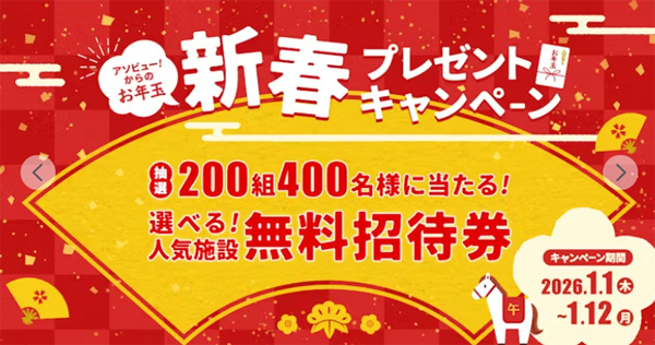 アソビュー!厳選の人気レジャー施設のペアチケットなどが当たるお年玉キャンペーンを開催!
